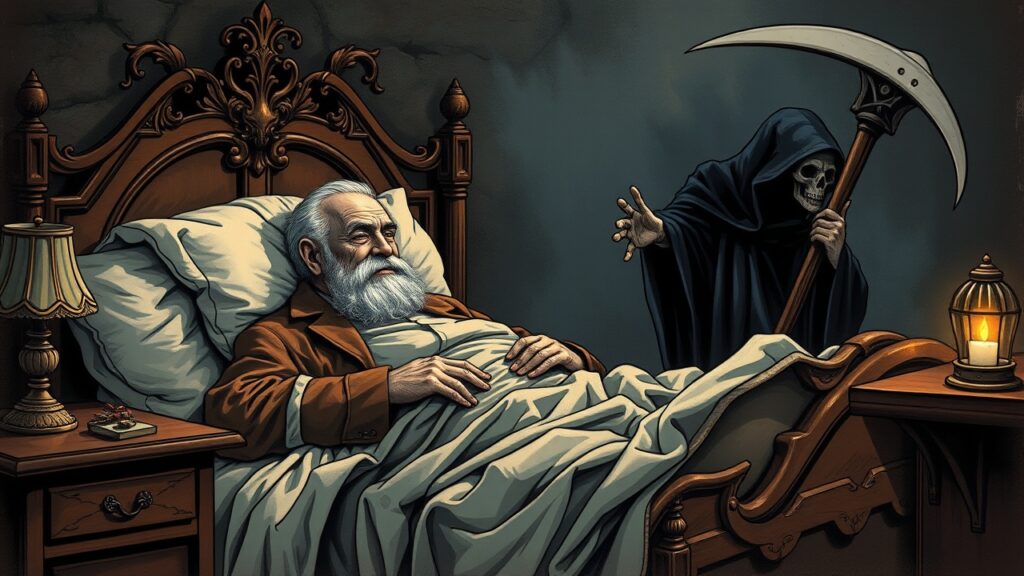 Holding up his hands in a last prayer to have his fate reversed, he saw an alteration in the Phantom’s hood and dress. It shrunk, collapsed, and dwindled down into a bedpost.